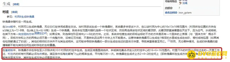 满足条件后每刻都有1/700的概率生成,平均每35秒一次。铁傀儡在生成点上方2×4×2的空间上(即铁傀儡所在生成方块的西北角处水平居中点)只能有非固体方块,其所在生成方块必须是固体方块。