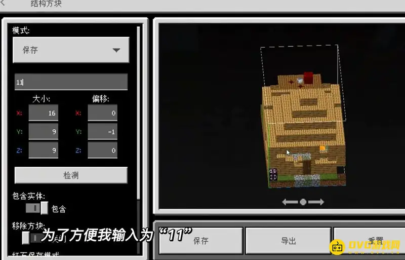 2.进入结构方块,配合移动右边的演示方向进行查看调整左边的大小,偏移量以适配模型。调整完毕之后,选择模式为保存,输入模型名称为11。再点击位于下面的保存按钮。