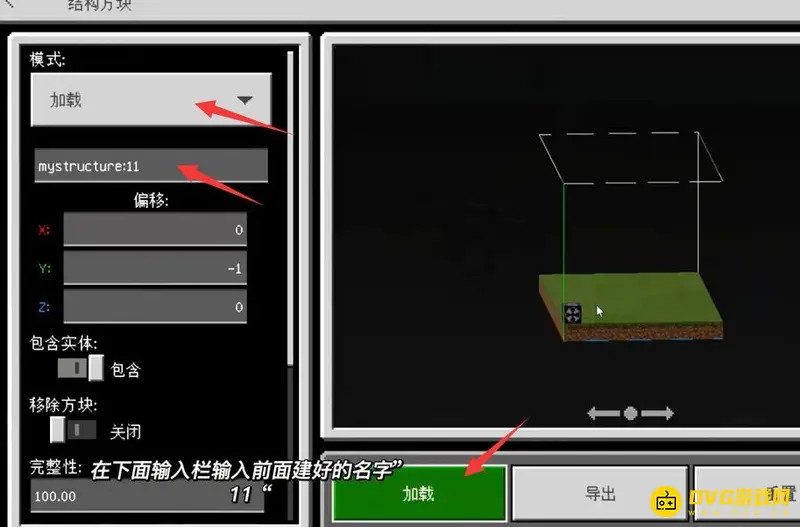 4.进入结构方块,修改模式为加载,输入模型名称,点击加载按钮。
