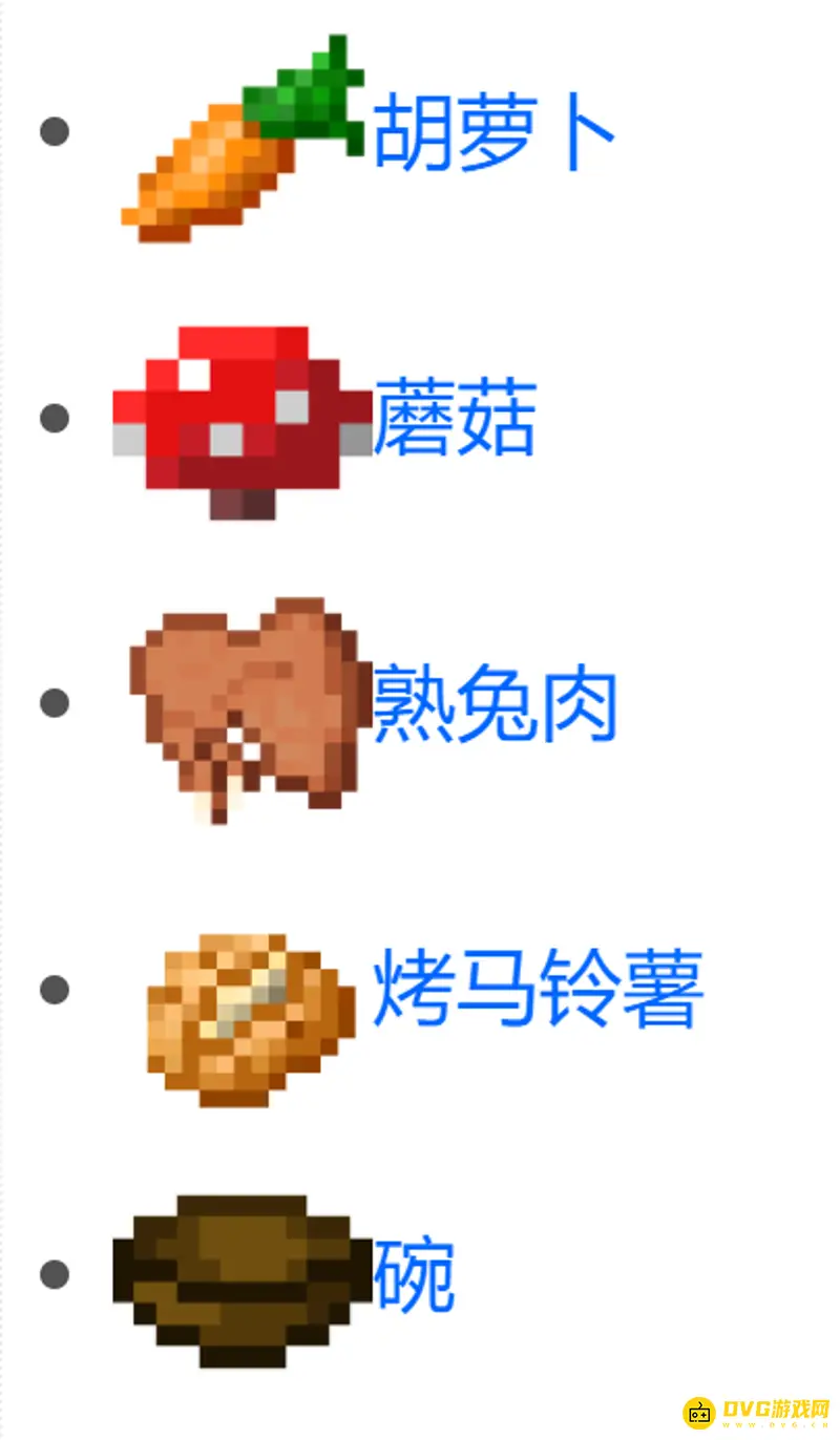 1、兔肉煲合成配方为:1个胡萝卜、1个任意蘑菇、1个熟兔肉、1个烤马铃薯、1个碗。每个兔肉煲回复10饥饿值和12饱和度。