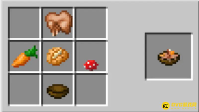 2、在工作台中江胡萝卜、任意蘑菇、熟兔肉、烤马铃薯、碗按图中排列可以获得一个兔肉煲。