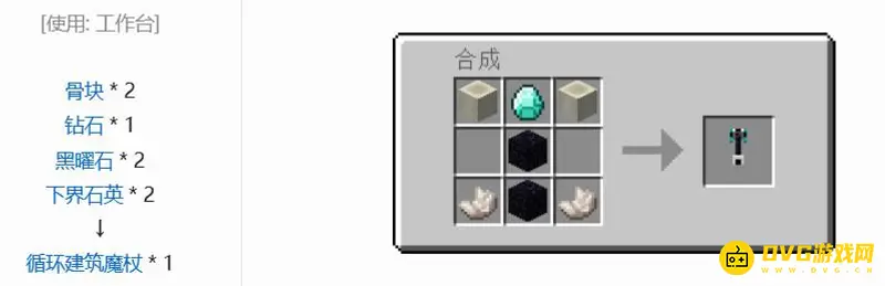 使用两个骨块,一个钻石,两个黑曜石和两个下界石英,就可以制作出建筑魔杖了。建造完成后默认是箱子模式,有2排共18个格子用于存放建筑用方块。按右键打开箱子进行交互。