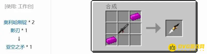 亚空之矛需要用两个奥利哈刚锭和一把影刃在工作台这里合成。点击左键时会在玩家的头顶射出一根亚空之矛向前方穿透造成18点伤害。