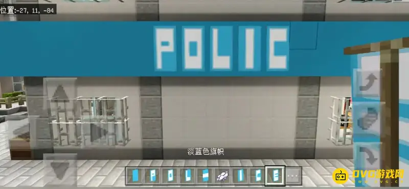4、最后再用淡蓝色旗帜在淡蓝色混凝土块上铺出“POLICE”。房子的每一个面都要铺,这样警察局就搭建完成了。