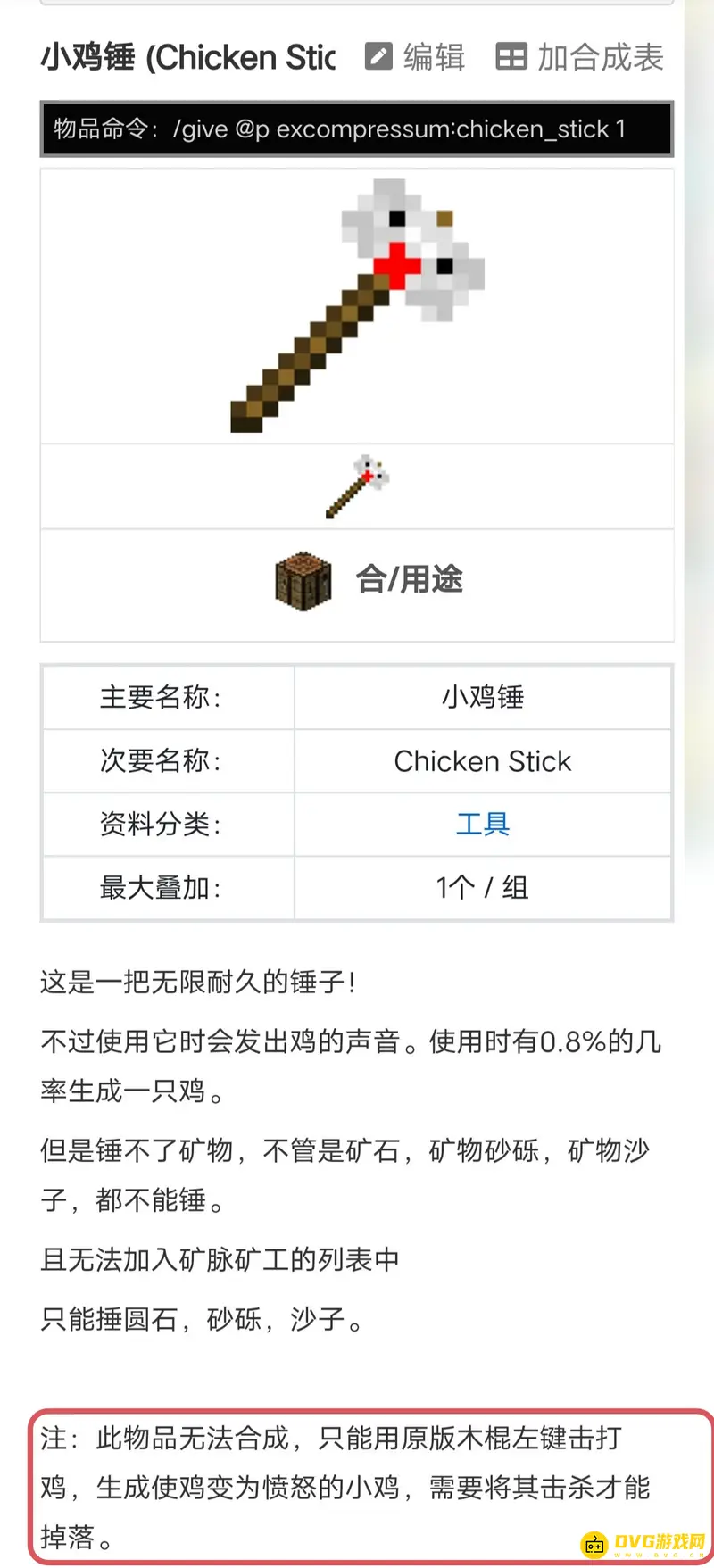 此物品无法合成,只能用原版木棍左键击打鸡,生成使鸡变为愤怒的小鸡,需要将其击杀才能掉落。攻击力较高,不建议在没有防护措施的情况下大量生产。