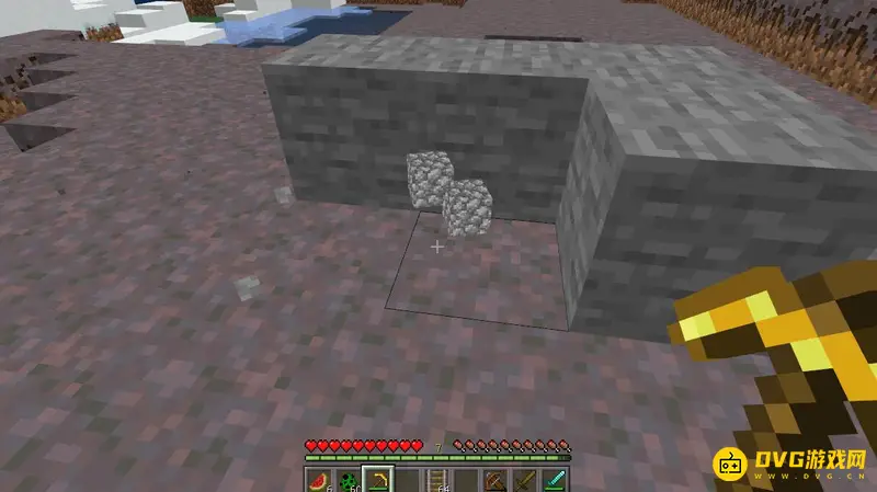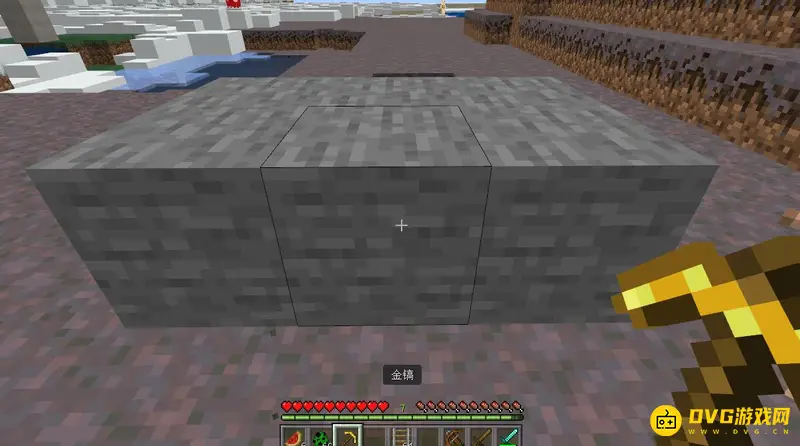 1,例如我们可以拿着金镐进行挖掘石头,首先拿着镐子对着石头点击鼠标左键。