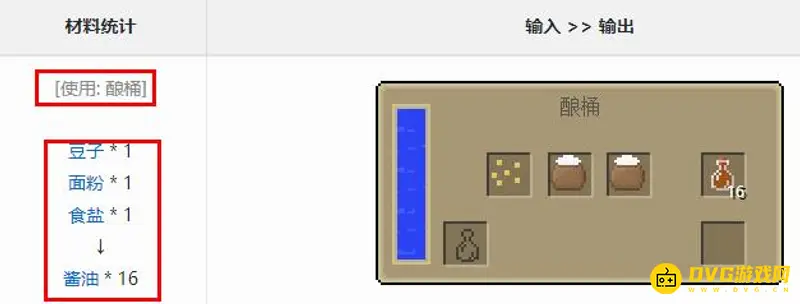 根据我的世界官方合成表,使用一份豆子、一份面粉、一份食盐在酿桶上就可以合成得到十六份酱油,注意第二格为面粉,第三格为食盐。