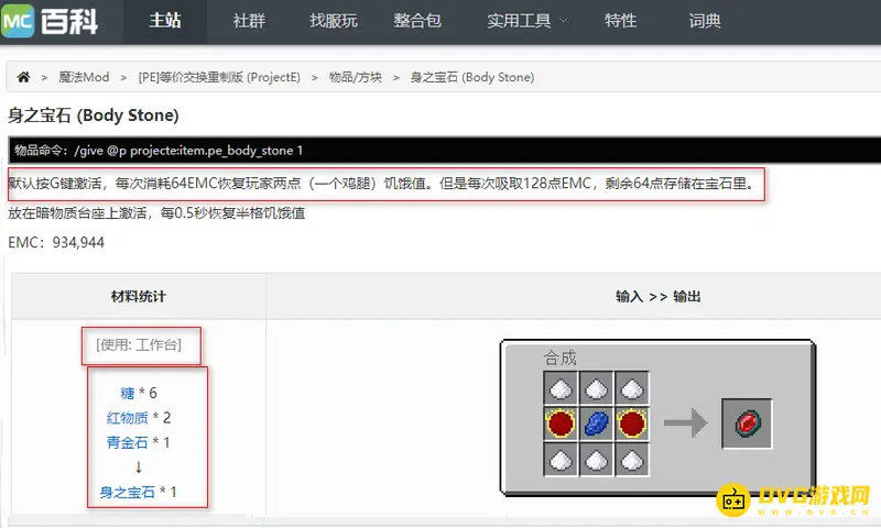 使用工作台消耗六份糖,两份红物质,一份青金石可以合成一份身之宝石。默认按G键激活,每次消耗64EMC恢复玩家两点(一个鸡腿)饥饿值。但是每次吸取128点EMC,剩余64点存储在宝石里。