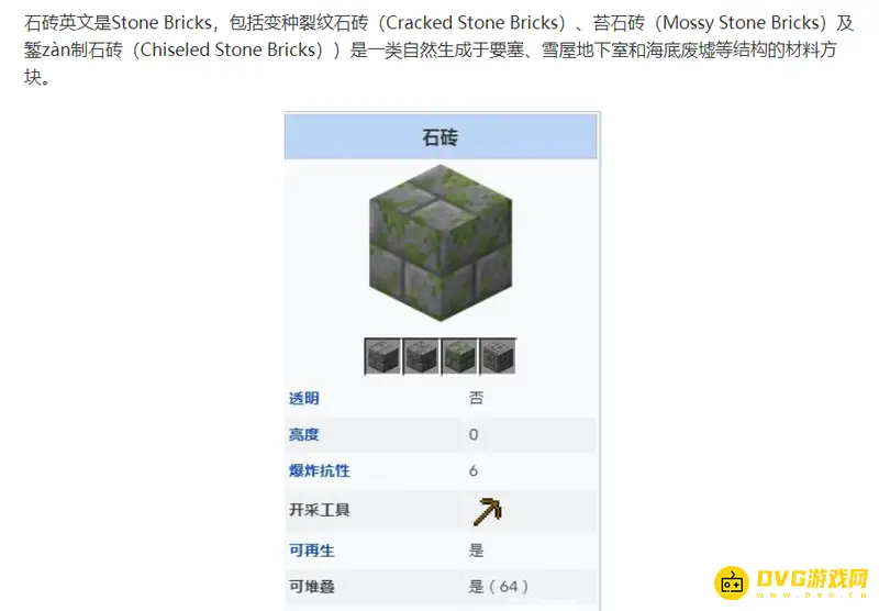 我的世界石砖英文是Stone Bricks。包括变种裂石砖(Cracked Stone Bricks)、苔石砖(Mossy Stone Bricks)及錾制石砖(Chiseled Stone Bricks)是一类自然生成于要塞、雪屋地下室和海底废墟等结构的材料方块,可以使用/give指令获得。