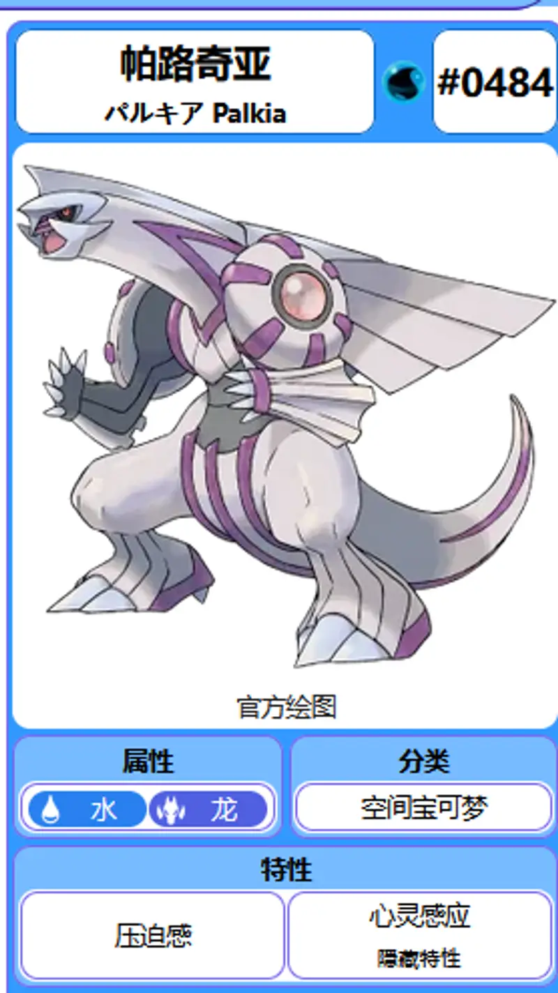 2、帕路奇亚是一只水属性和龙属性的宝可梦,分类是空间宝可梦,特性是压迫感,隐藏特性是心灵感应。