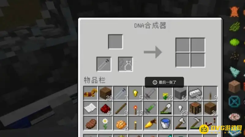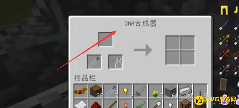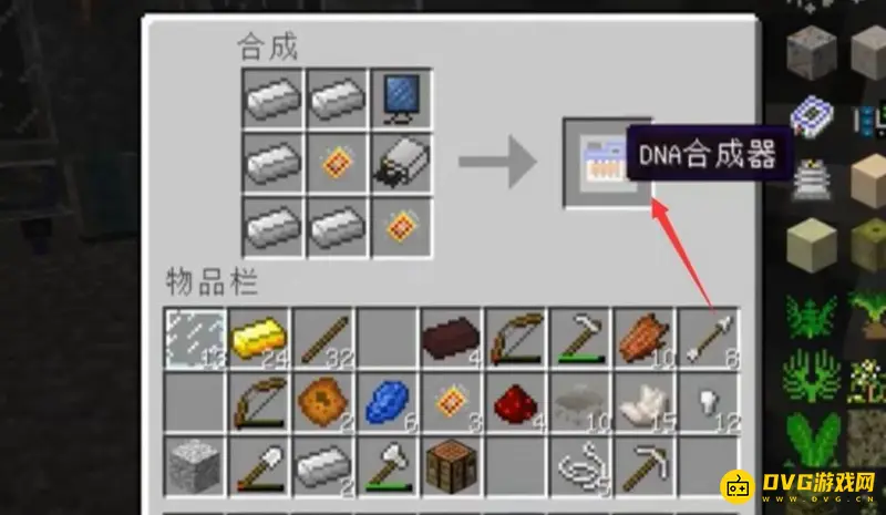 1、进入我的世界游戏,用铁钉、显示屏等合成一个DNA合成器。