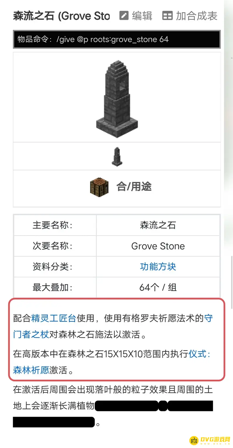 配合精灵工匠台使用,使用有格罗夫祈愿法术的守门者之杖对森林之石施法以激活。在高版本中在森林之石15X15X10范围内执行仪式:森林祈愿激活。