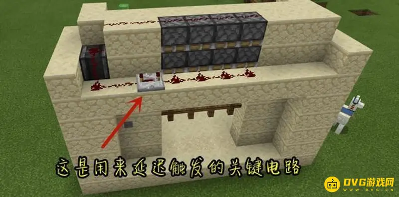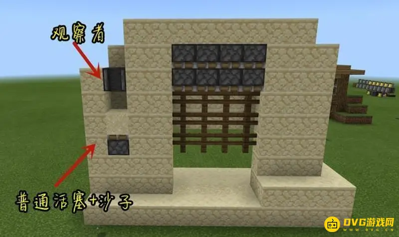 8、按下按钮触发活塞,沙子被顶起,触发上方的观察者,然后观察者旁边的电路就会被激发,让门头顶的活塞被放下,栅栏门归位。