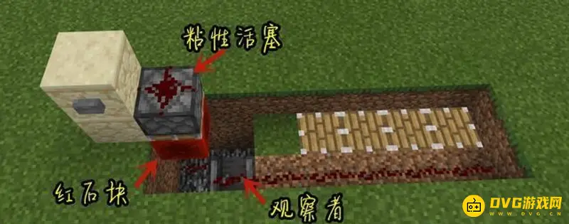 3、红石线路上面盖上一层方块,然后上面再铺上一层红石线路,旁边摆上观察者,用以连接上下两层的红石线路。旁边则放上粘性活塞和红石块,左边放上按钮,用以激活整个装置(如下图摆放):