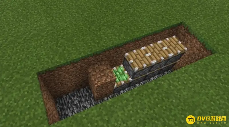 1、首先,我们需要挖一个三格深的长坑,然后底下放粘性活塞,上面放普通活塞: