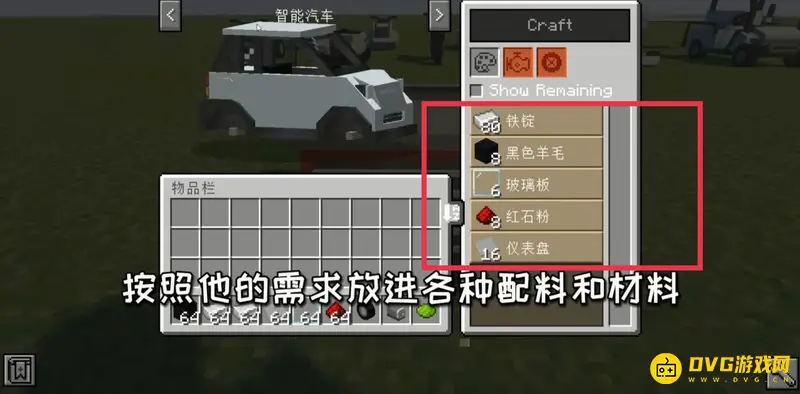 2.然后把制造台放置在地上,打开制造台后找到智能汽车的合成配方,并准备好所需的材料,把材料投入制造台中。