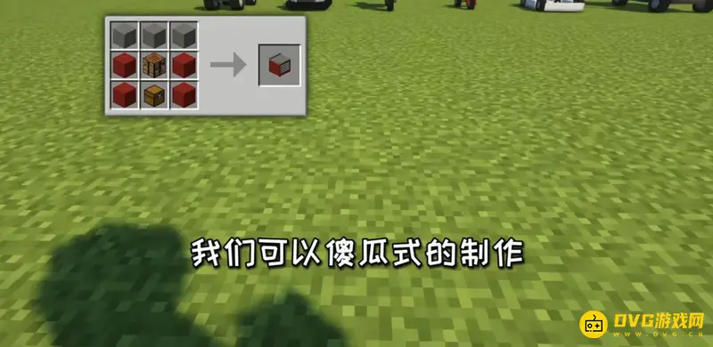 1.首先需要有载具模组才能合成汽车,先用石块、红石块、工作台和箱子合成一个制造汽车的制造台。
