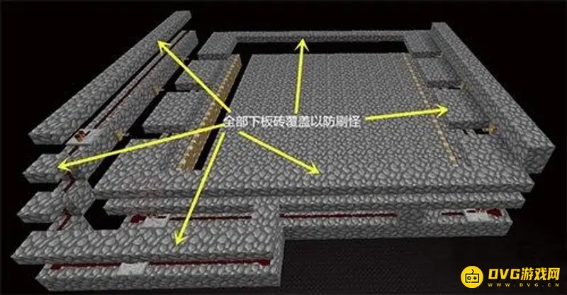 5、将刷怪塔都铺上半砖,四周也要围一下。这样就做好了。最后还有一些注意事项:平台一定要建造的高一些,确保猪人可以摔死,玩家没事的时候也可以手动去杀一些,不但有经验,还有可能爆到金锭呀。