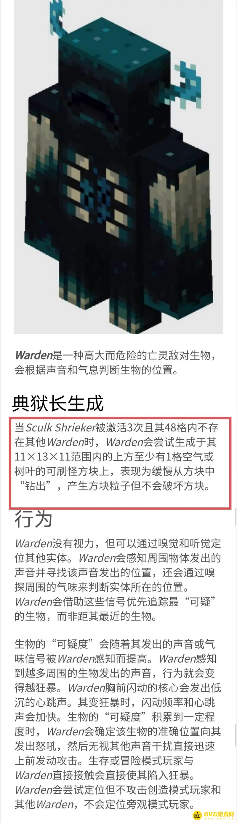 典狱长又叫循声守卫是1.19版本中新上线的生物,唯一生成于Deep Dark生物群系的生物。在Deep Dark中的Sculk Shrieker被多次激活时从Sculk植被下钻出。