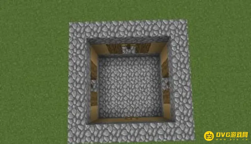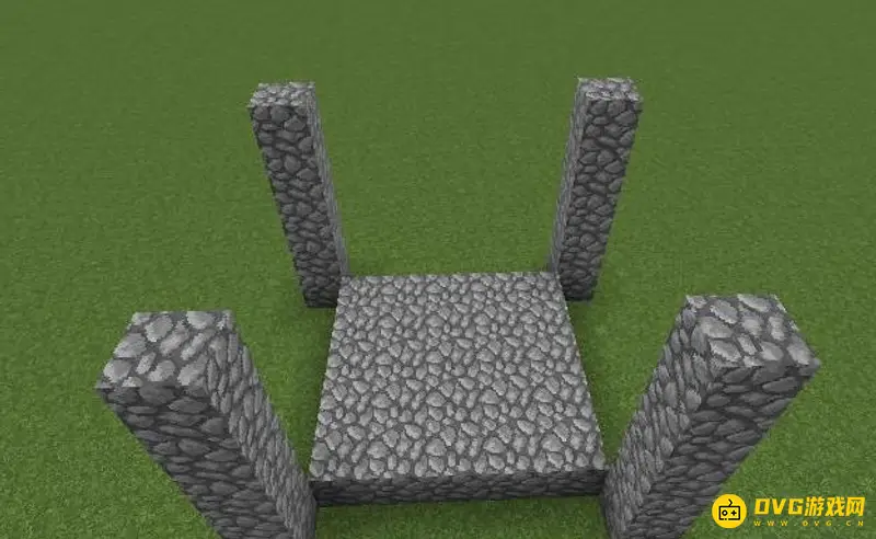 在平地上铺设5x5的圆石作为地基,然后在四个角斜对着出去一格的位置上各立一根5格高的圆石柱。