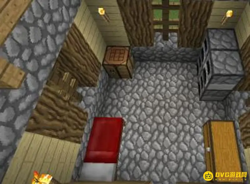 内部装饰方面一切从简,只放置一些常用的功能性方块,比如说工作台、熔炉、床和箱子等等。