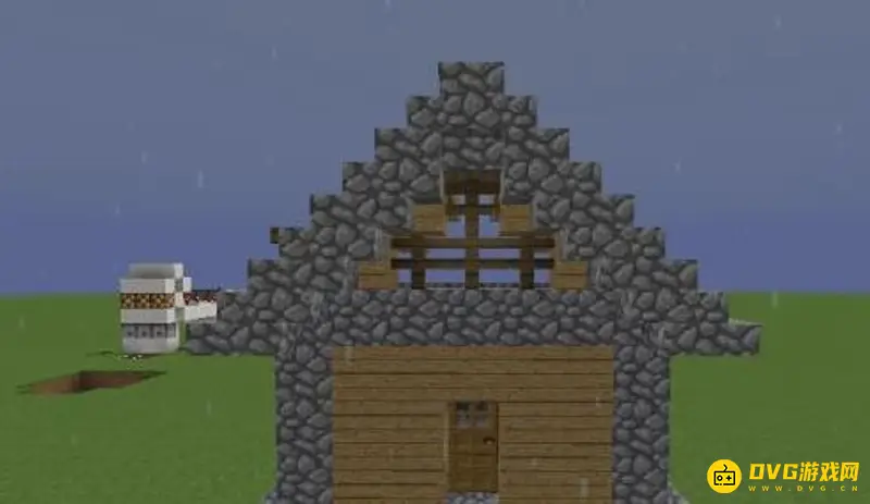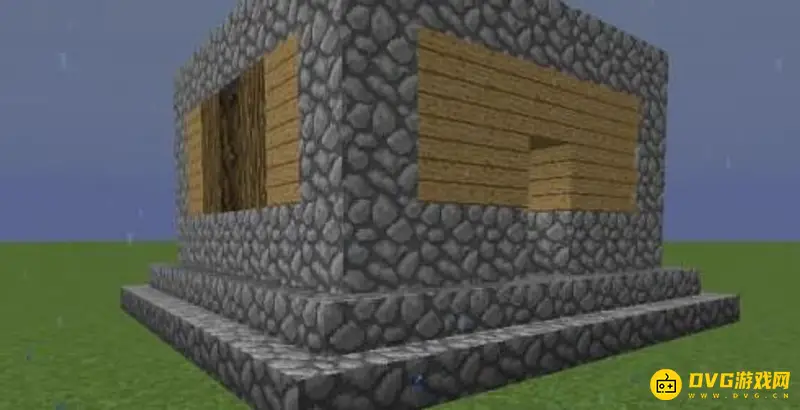 一侧是有门的,门下垫个圆石。另外三侧都是上下一条圆石,中间是两侧用木板和原木装饰,中间用栏杆搭建窗户。