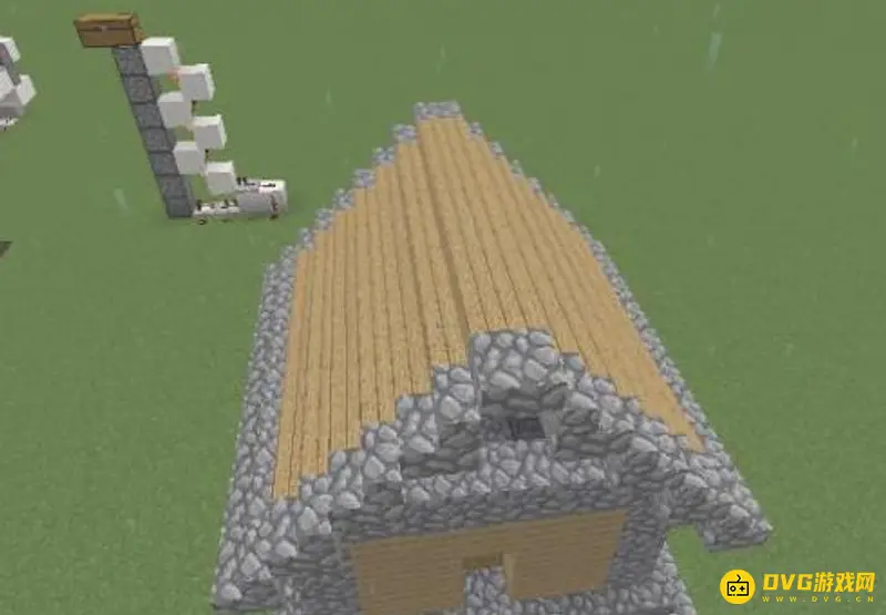 在两侧逐渐向上搭建橡木楼梯直到封顶(封顶用一层橡木台阶),注意屋顶的外圈要用圆石材质的楼梯/台阶来装饰。