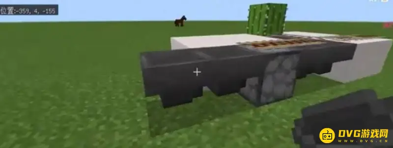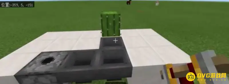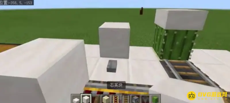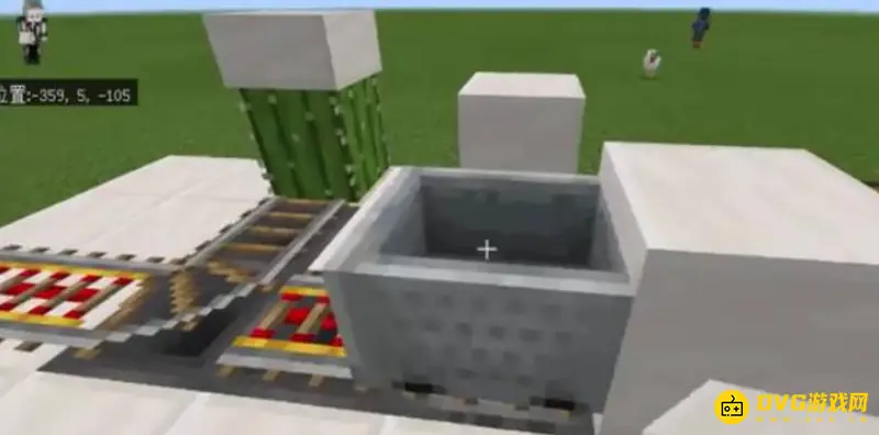 5.然后在仙人掌上饭上半个方块,在轨道旁边放上按钮,按钮旁边也放一个方块。
