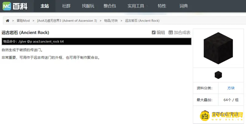 远古岩石自然生成于破损的传送门。非常重要,可用作于远古传送门的外框,也可用于制作聚合台。