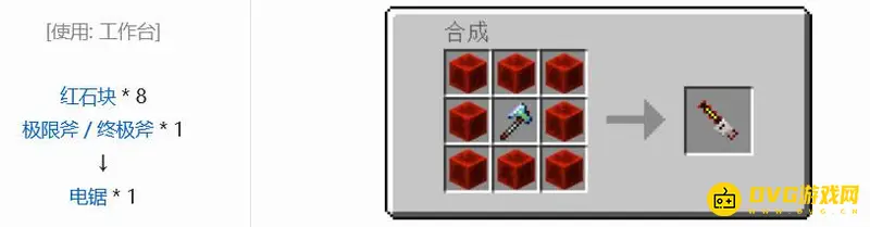 合成电锯是要使用8个红石块,一个极限斧或者终极斧就可以进行合成了。电锯具有60点攻击伤害,而且电锯在砍树的时候能够破坏以玩家为中心范围6格内的所有木头,如果破坏地上的草也会变成原版的灌木。电锯并不是真正的挖掘工具,因为用它来破坏方块会损耗两点耐久。