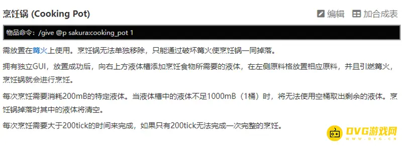 需放置在篝火上使用。烹饪锅无法单独移除,只能通过破坏篝火使烹饪锅一同掉落。拥有独立GUI,放置成功后,向右上方液体槽添加烹饪食物所需要的液体,在左侧原料格放置相应原料,并且引燃篝火,烹饪锅就会进行烹饪。