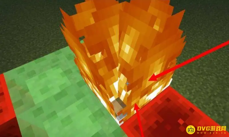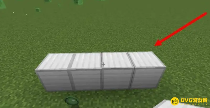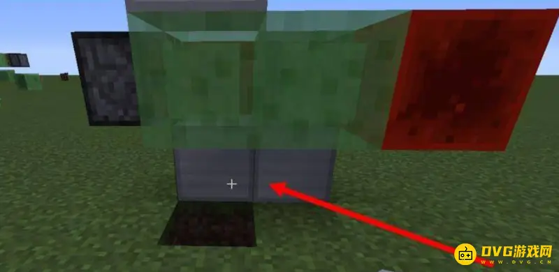 7.接着在上边靠近普通活塞的粘液块上放一个方块,这就是挡着你的,你就站在这个方块的前面,也就是图中箭头指的位置。