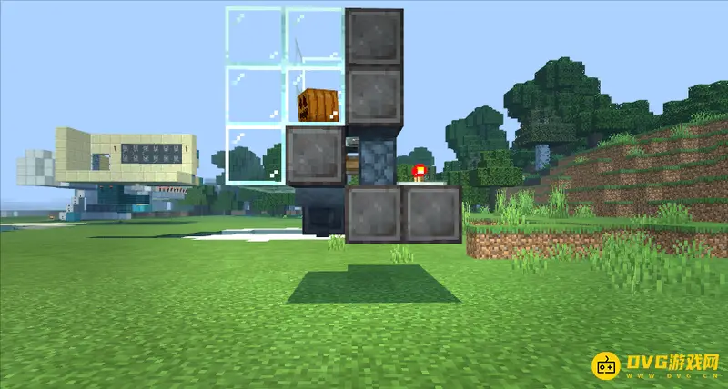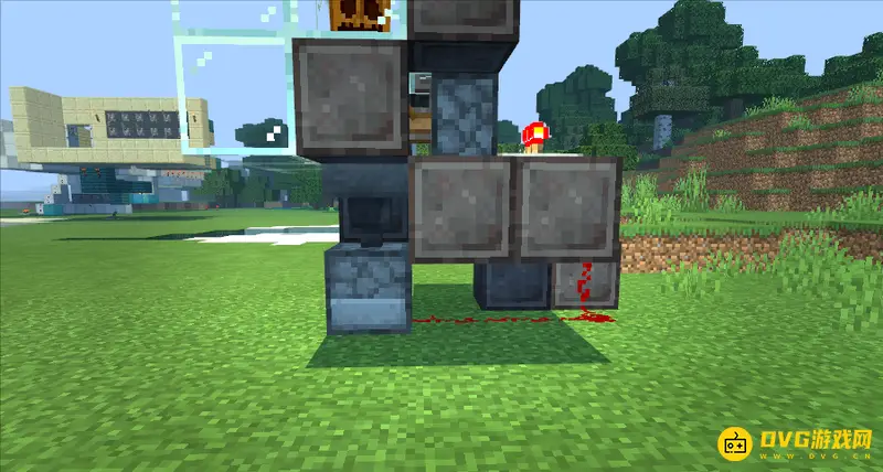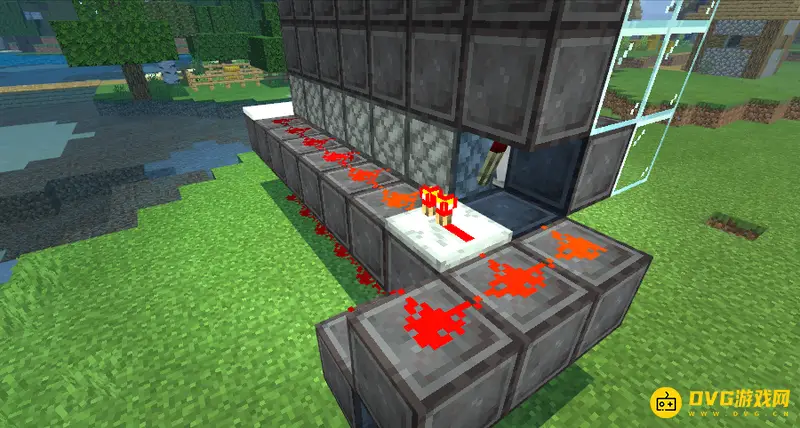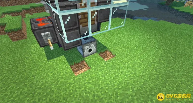 2、拆除了雪糕机下方的木桶,然后转到机器的后方,在有红石粉一侧的下方放上一个普通方块。