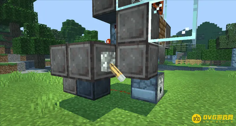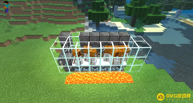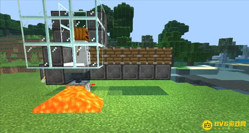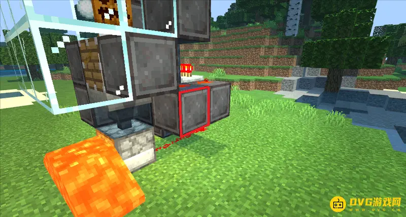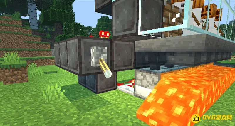 5、然后在发射器前方一格的左右两侧,挖出两格凹槽。并在中间的方块倒上岩浆,这样子初级火球炮就完成了。
