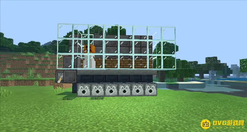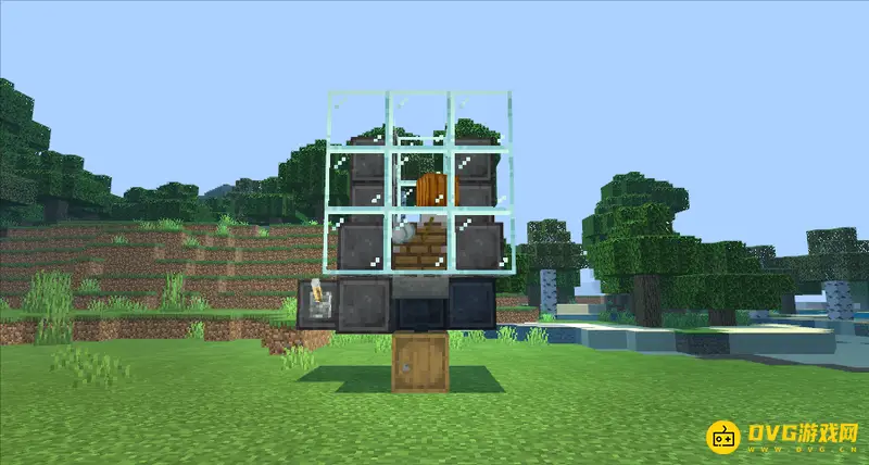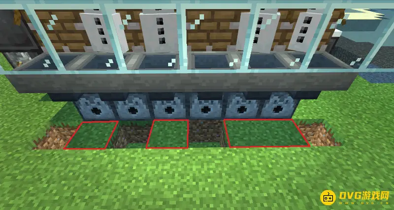 8、延展原本的玻璃块与后方的普通方块,敲掉漏斗上方的方块,补上漏斗下方的发射器。