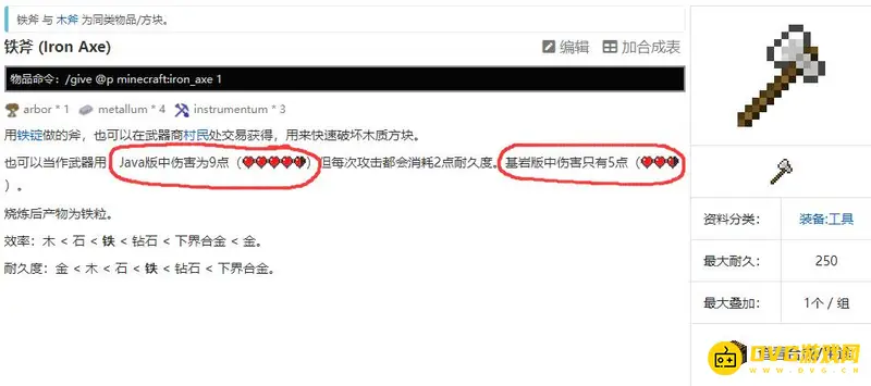 首先我们搜索并进入我的世界铁斧的相关说明,然后就可以在界面中发现,铁斧Java版中伤害为9点,基岩版中的伤害为5点。
