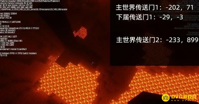 在主世界建立第二个地狱门,它距离我原本的地狱门能有八百多格距离,在上面图片就能看到右上角坐标数值,然后我进入地狱门之后,我又传送到我原本第一个(下届的)地狱门那里去了。到底怎么解决这个问题呢?其实这个解决办法很简单,就是给第二个主世界的门,在地狱中对应的坐标也就是主世界X和Z轴除以8这个坐标附近,自己手动建立一个地狱门就行了。