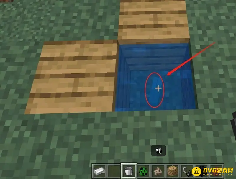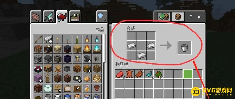 1、首先我们需要用工作台制作一个“铁桶”,制作方法如下,为三个铁锭放置在一起。