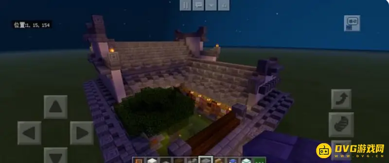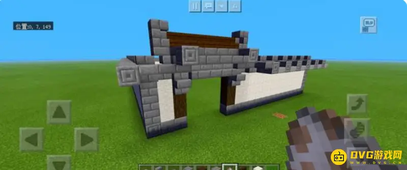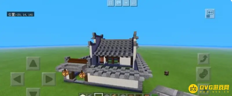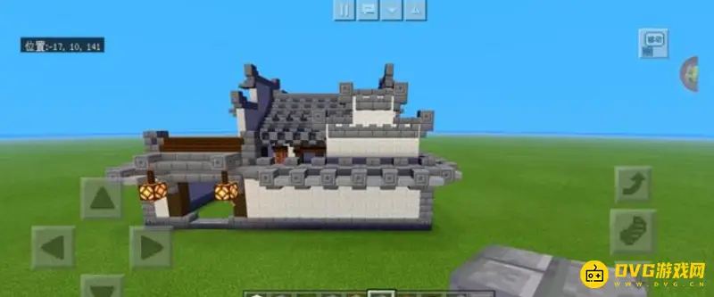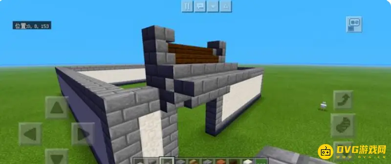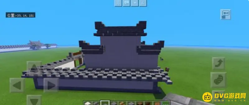 22、左右两侧的马头墙使用白色石英填充前面预留好的空档,具体宽度就是你屋子的宽度,高度,高出屋顶两三格即可,然后用砖石阶梯和砖石半砖做出装饰
