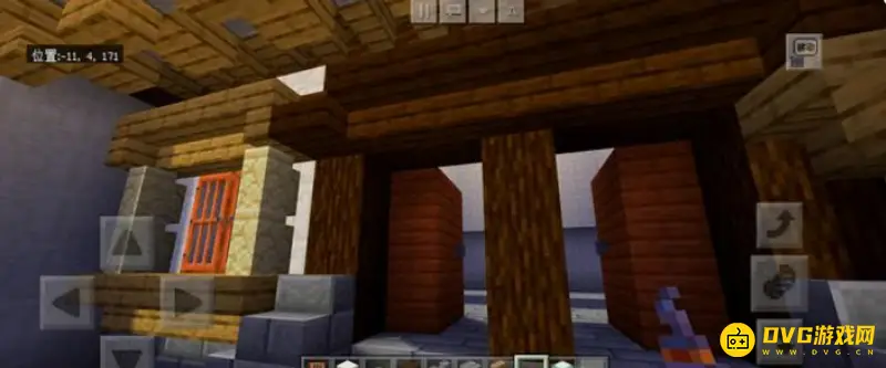 5、大门部分用的是深色橡木和砖石阶梯和半砖,由大门的边框向下两格使用倒放的砖石阶梯,砖石阶梯中间放半砖,然后在大门的边框上放置橡木阶梯,最后使用砖石做出装饰