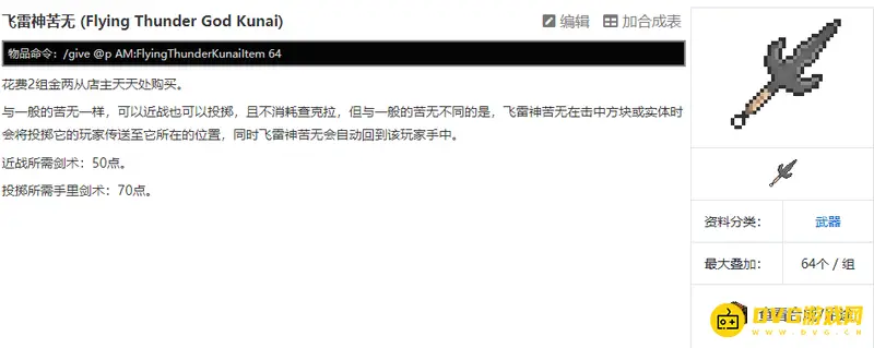 飞雷神只能购买。在我的世界火影忍者mod游戏中,飞雷神作为一种特殊的武器,玩家只能花费2组金在店主天天处购买。装备使用该武器也需要一定的要求,其中近战需要剑术50点,投掷需要剑术70点。