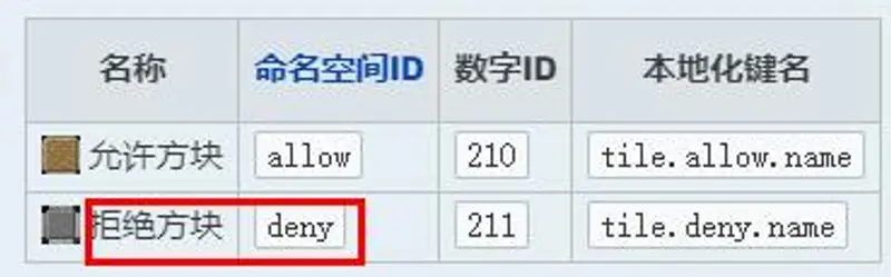 根据我的世界官方百科,拒绝方块的英文(命名空间ID)是deny,与之对应的允许方块则是allow。