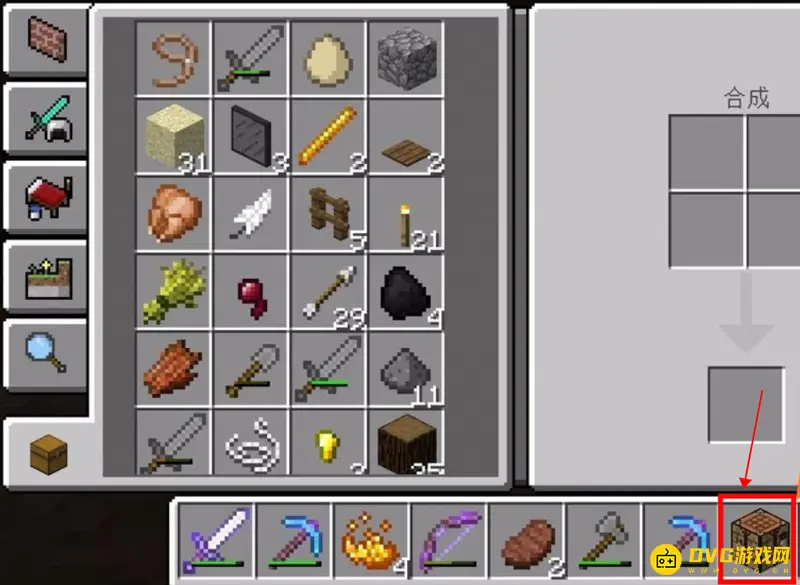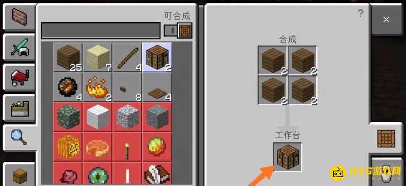 3、合成橡木板之后,我们点击自己的背包,然后发现可以合成工作台。我们点击合成工作台,然后将工作台放在快捷工具栏中。然后再将工具台放置在地面上即可,如下图所示。