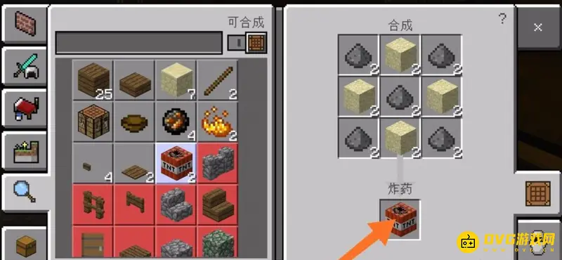 4、制造好工作台之后我们点击工作台搜索火药发现火药由五个火药和四个沙子制造而成。如下图所示。