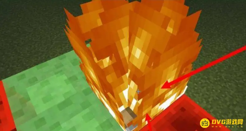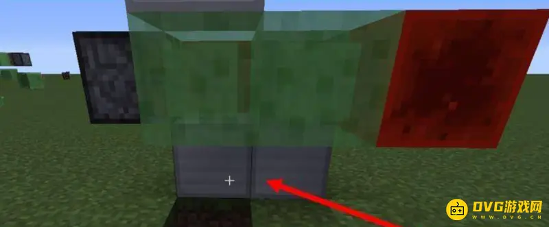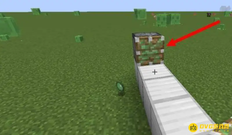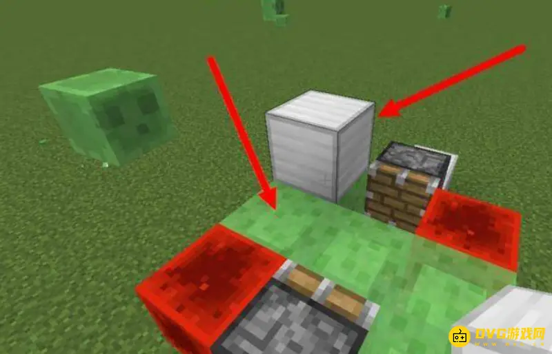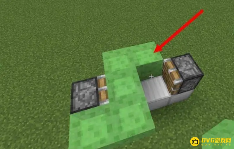 7.接着在上边靠近普通活塞的粘液块上放一个方块,这就是挡着你的,你就站在这个方块的前面,也就是图中箭头指的位置。