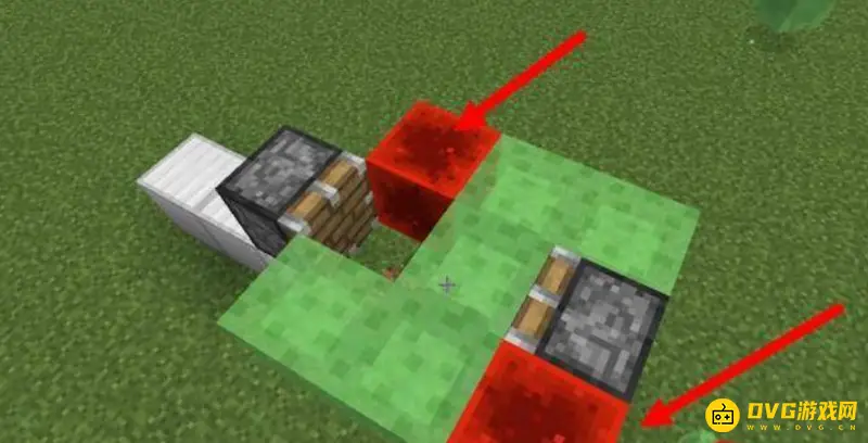 5.接着按图中的位置放上红石块,在放置粘性活塞旁边的红石块后,位置会向前移动一格,不用管它就可以。