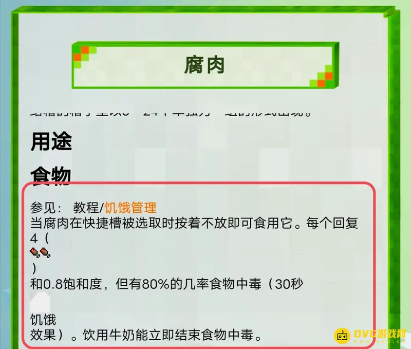 吃了腐肉每个回复0.8的饱和度,但是有几率食物中毒。当腐肉在快捷槽被选取时按着不放即可食用它,如果中毒了饮用牛奶能立即结束食物中毒。