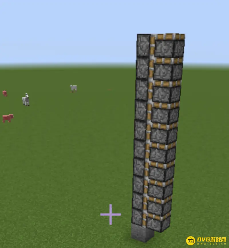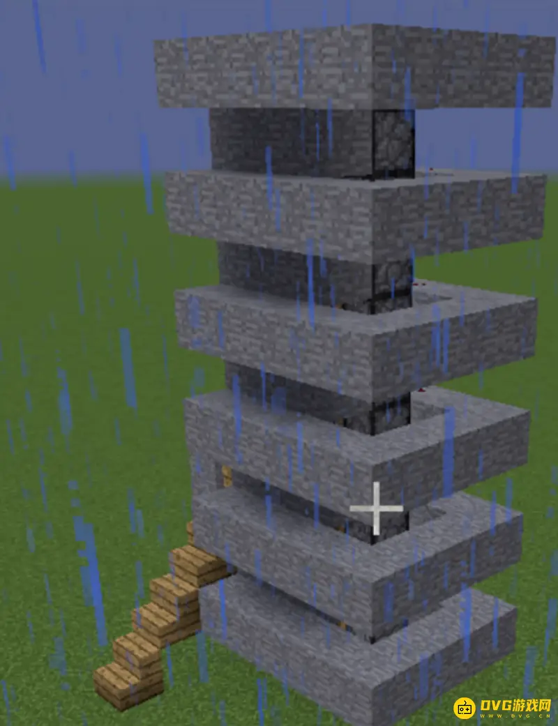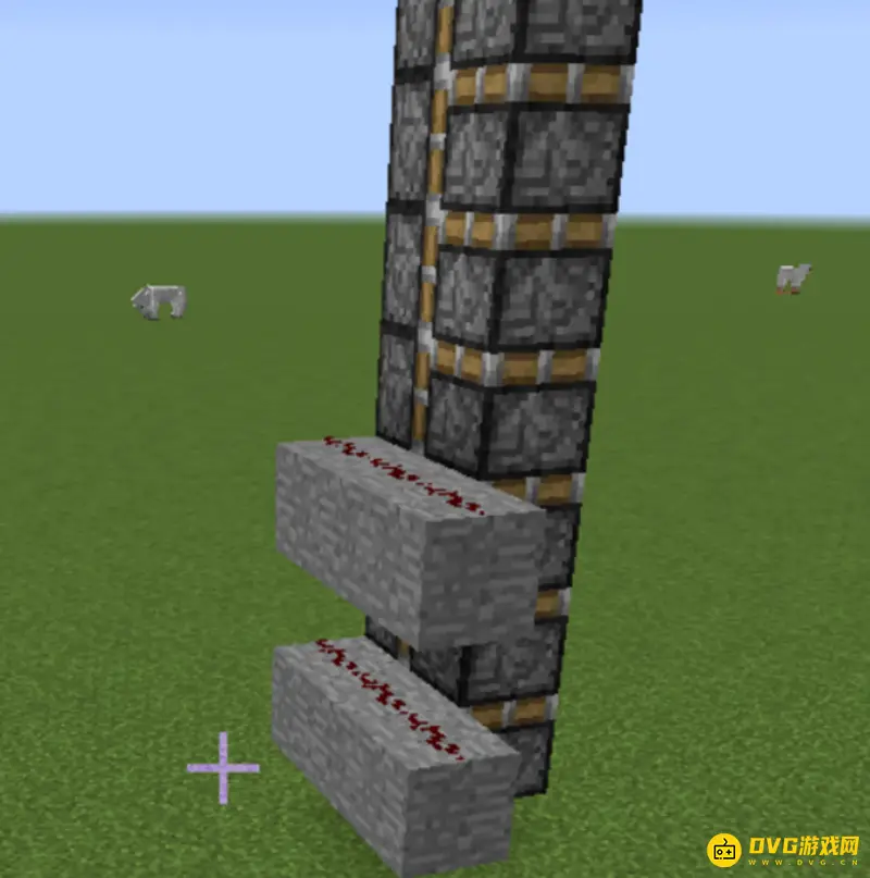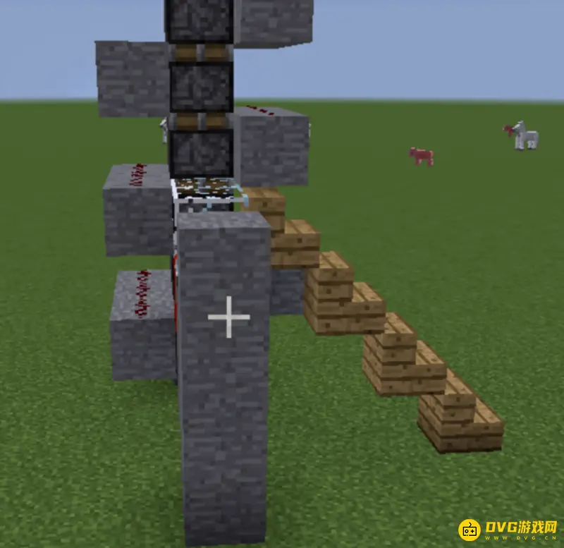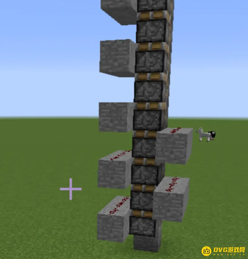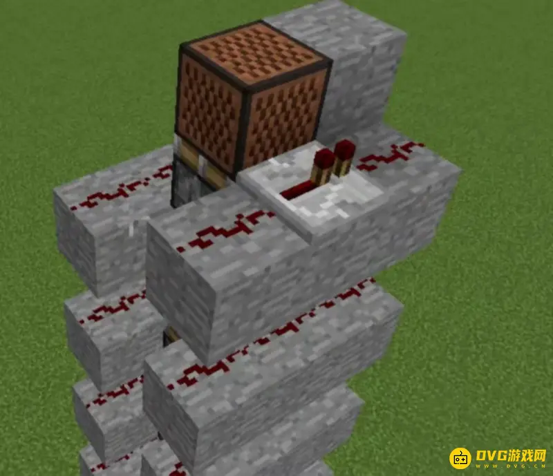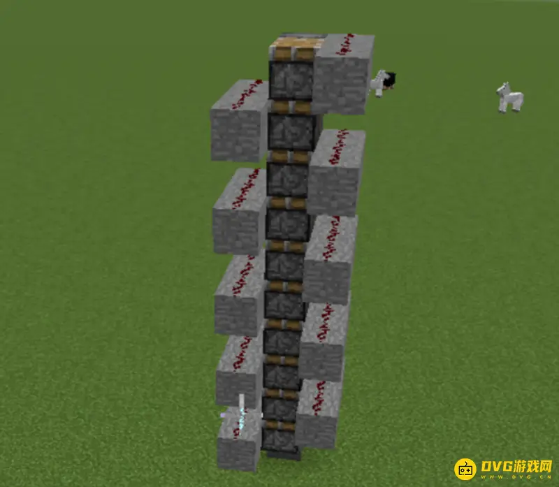 4.按照这样的方式向上,一直铺。然后另一侧跟左侧叉开,也是同样的方法放石头与红石