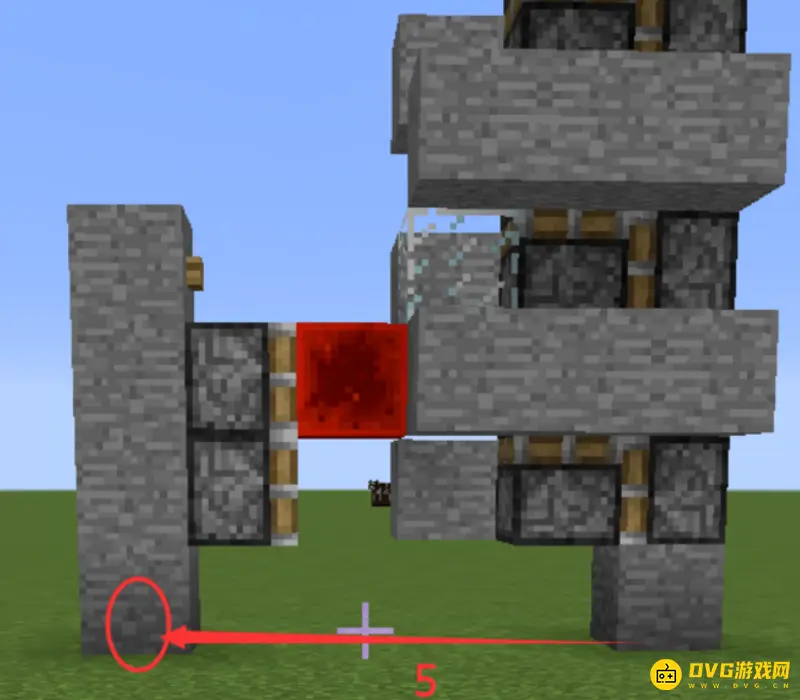 9.最底层的石头距离5格的地方放4个石头,石头中间位置放两个活塞,活塞上方放一个按钮,第二个活塞前方放一个红石块