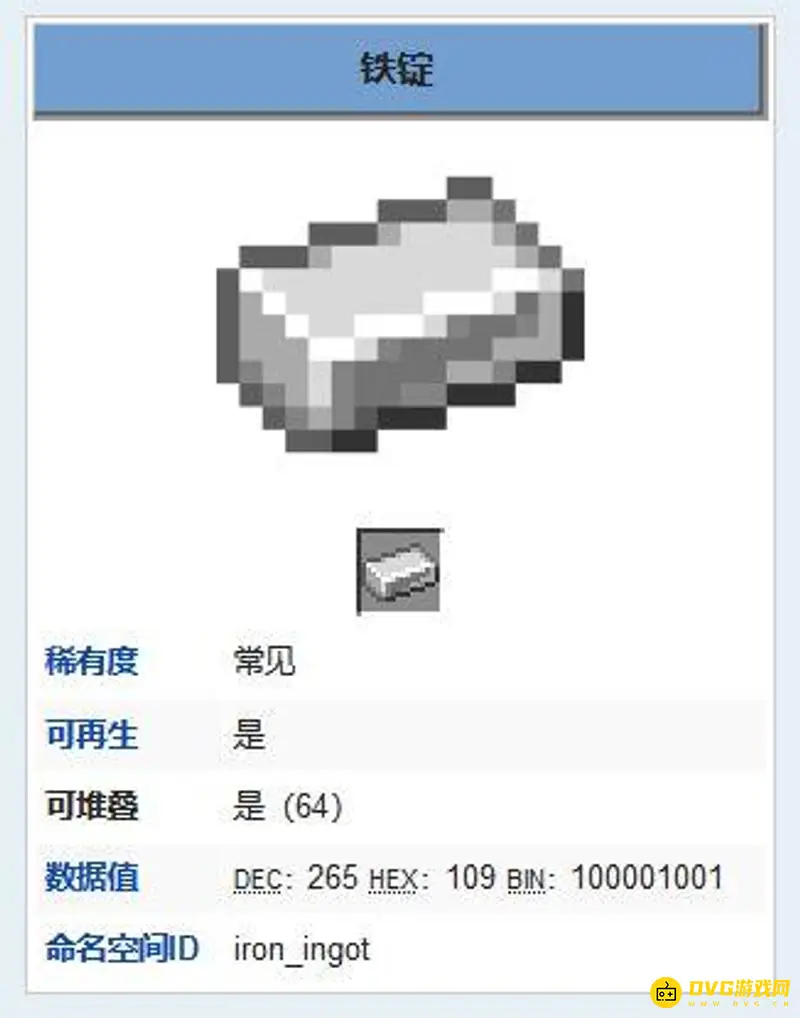 在游戏《我的世界》里铁锭可以用九个铁粒制作获得,也可以用一个铁块制作成九个铁锭,除此之外,玩家使用任意燃料烧纸铁矿石也可以获得0.7个铁锭,需要用到大量铁锭来制作装备和工具。